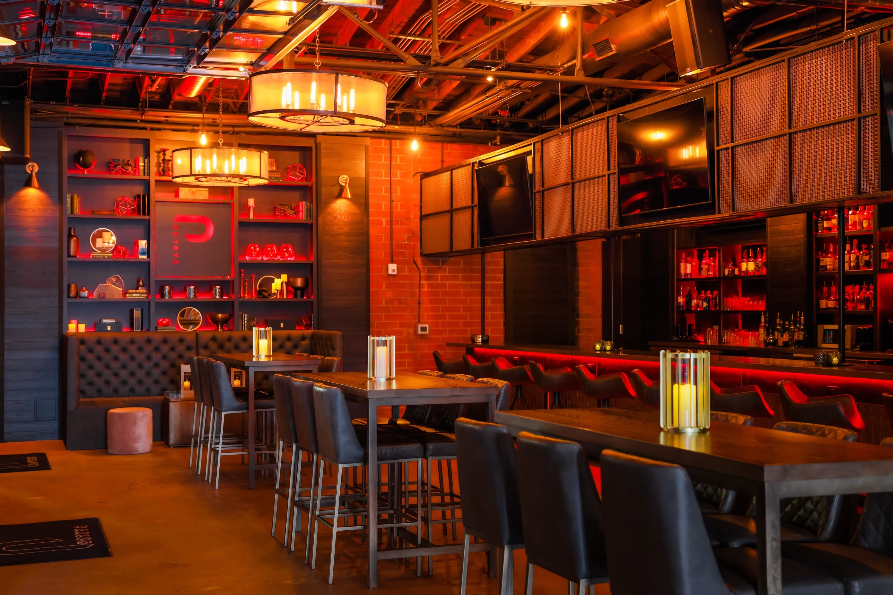 The Parlor is a stylish venue space with a 100-person capacity, exuding a sophisticated speakeasy lounge vibe. Perfect for intimate gatherings, cocktail parties, or special event.