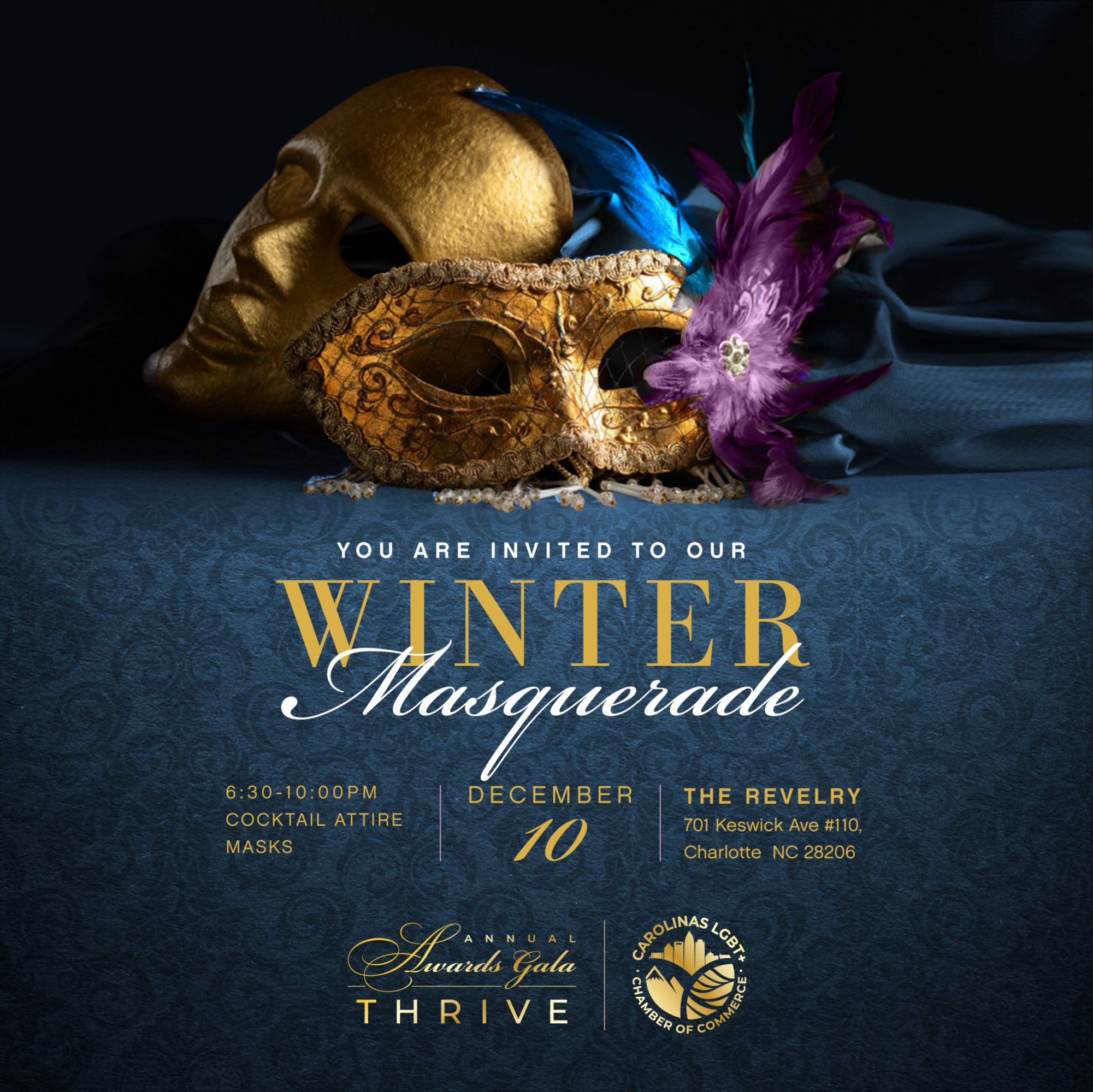 DESCRIPTION:Join us for an unforgettable evening at our annual THRIVE Gala & Awards Ceremony\, the signature event of the year celebrating excellence within the LGBT+ and ally business and professional community of the Carolinas.\n\nFor our 32nd year\, we're embracing the magic and mystery of a Winter Masquerade\, where elegance meets intrigue in a festive\, wintery setting.Held at the stunning Revelry at Camp North End\, the Gala will feature a night of recognition\, celebration\, and connection as we honor outstanding individuals and organizations who have made a significant impact on the LGBT+ community and beyond.Enjoy a dazzling cocktail hour filled with beautiful live entertainment while you peruse the silent auction\, all proceeds will go to a local nonprofit who has presented exemplary work in the community. Enjoy delicious food\, live entertainment\, and the much-anticipated awards ceremony among the wintery masquerades! Don your most elegant cocktail attire and prepare to dazzle with a masquerade mask that reflects the enchantment of the evening. Mark your calendar and prepare to thrive in a night of celebration\, community\, and inspiration.*TICKETS ARE NON-REFUNDABLE*