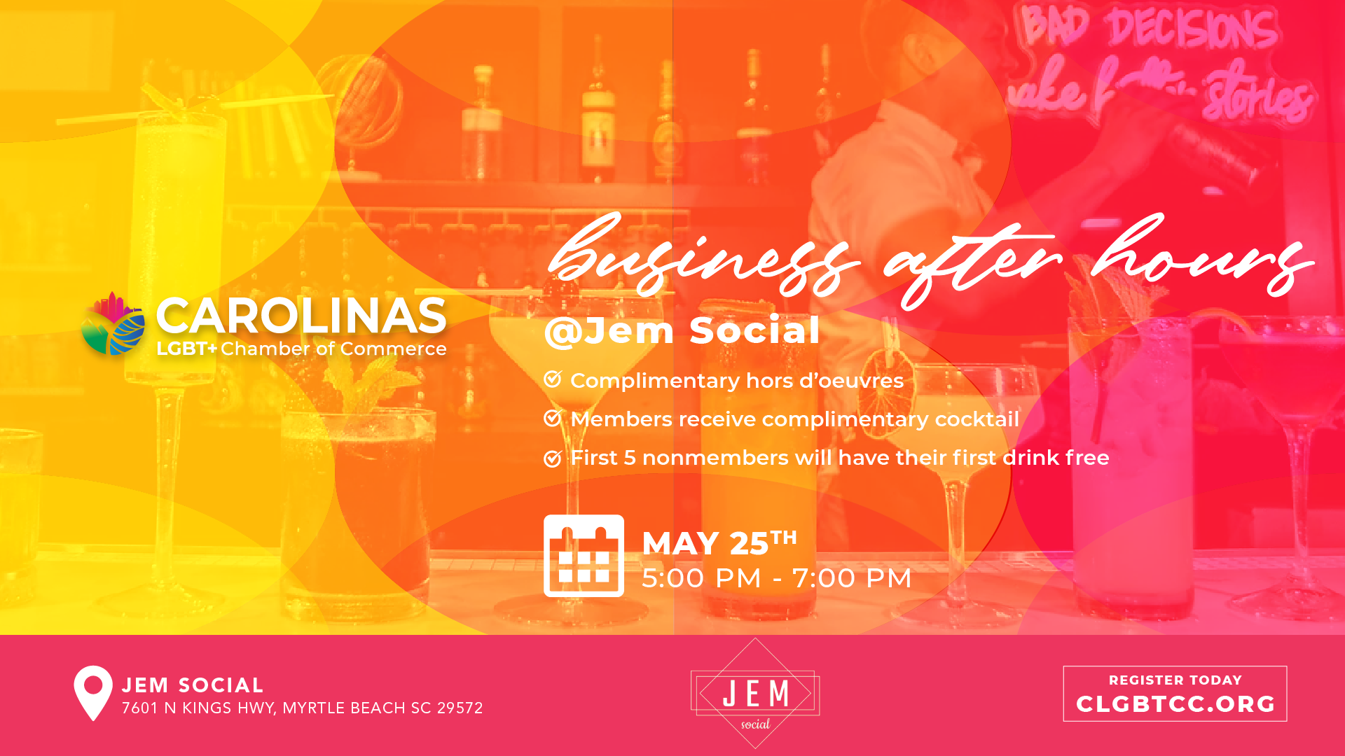 Join the Grand Strand Network of the Carolinas LGBTQ+ Chamber at Jem Social for our Business Mixer! Members will have their 1st drink covered by the Carolinas LGBT+ Chamber of Commerce. Appetizers will also be provided! Come for a great evening of networking, good food, and great drinks.