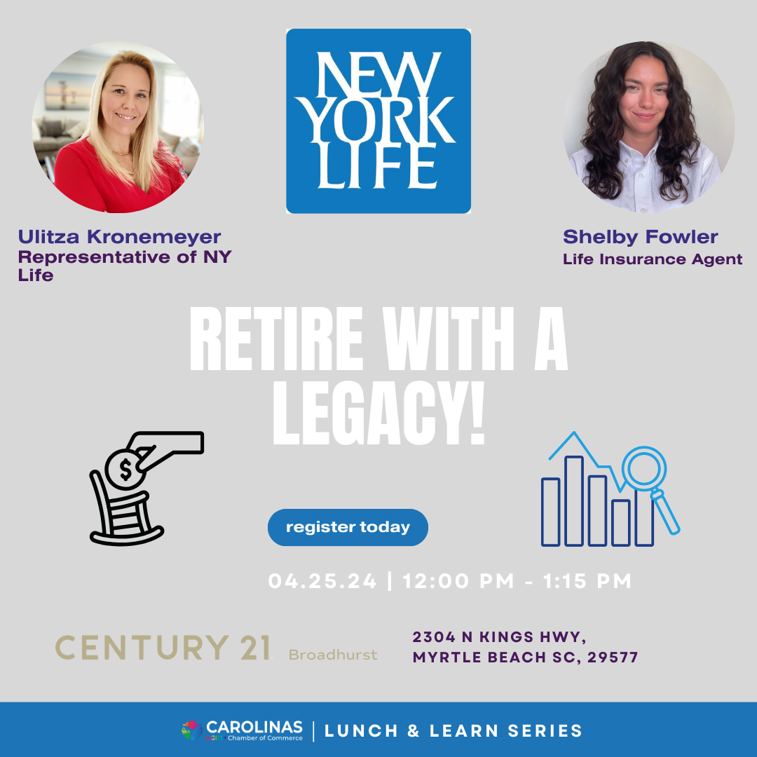 Join us in Grand Strand with Shelby Fowler and Ulitza Kronemeyer from New York Life to learn how you can start saving for your future self today. Building a legacy is more than just building your small business, it also means taking care of yourself when it comes time to retire.
